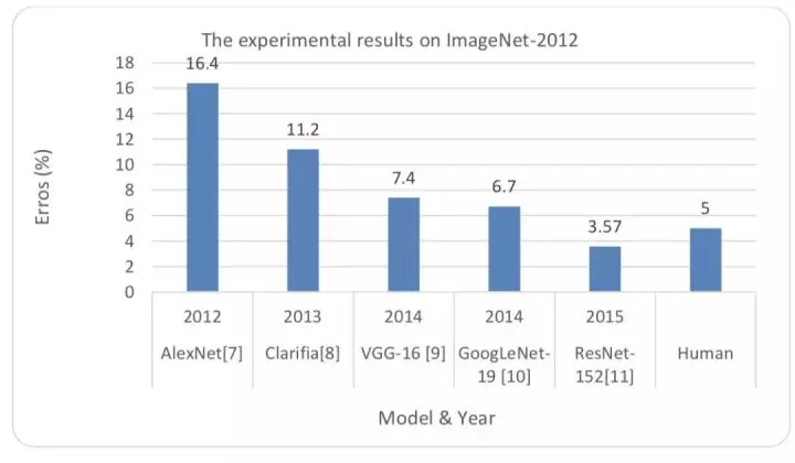 深度学习在图像分类领域的应用基准被称为大规模视觉识别挑战(LSVRC)。基于深度学习和卷积神经网络技术,深度学习在 ImageNet 测量精确度中有很好的表现 [11]。近日,Russakovsky 等人发表了一篇关于 ImageNet 数据集的文章及近年来研究者们实现的最高精确度 [285]。下图显示了 2012 年深度学习技术的发展历程。时至今日,我们开发的方法在 ResNet-152 上只有 3.57%的误差,低于人类约 5% 的误差。