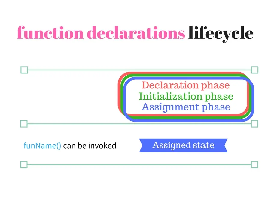 注意,根据变量的生命周期,声明阶段和一般说的变量声明是不同的术语。简言之,引擎在三个阶段处理变量声明:声明阶段、初始化阶段和赋值阶段。