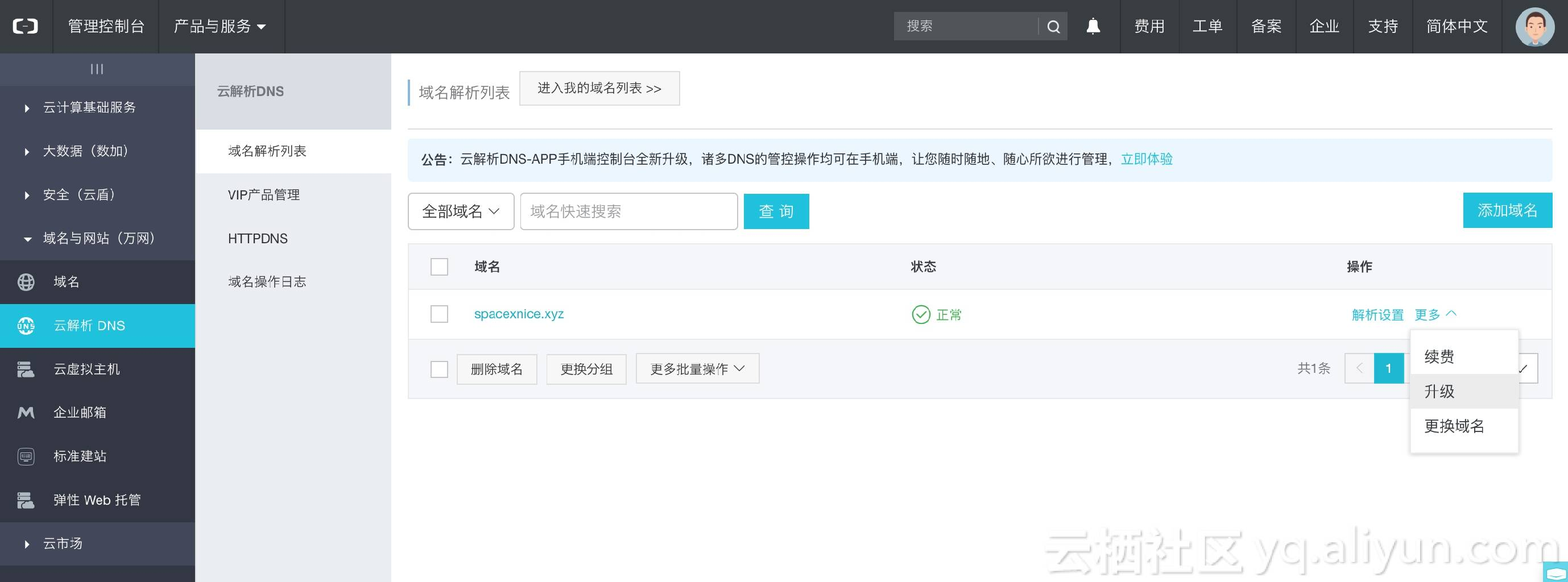 进入云解析控制台选择您刚刚购买的域名,更多里面选[升级]或者[升级VIP]