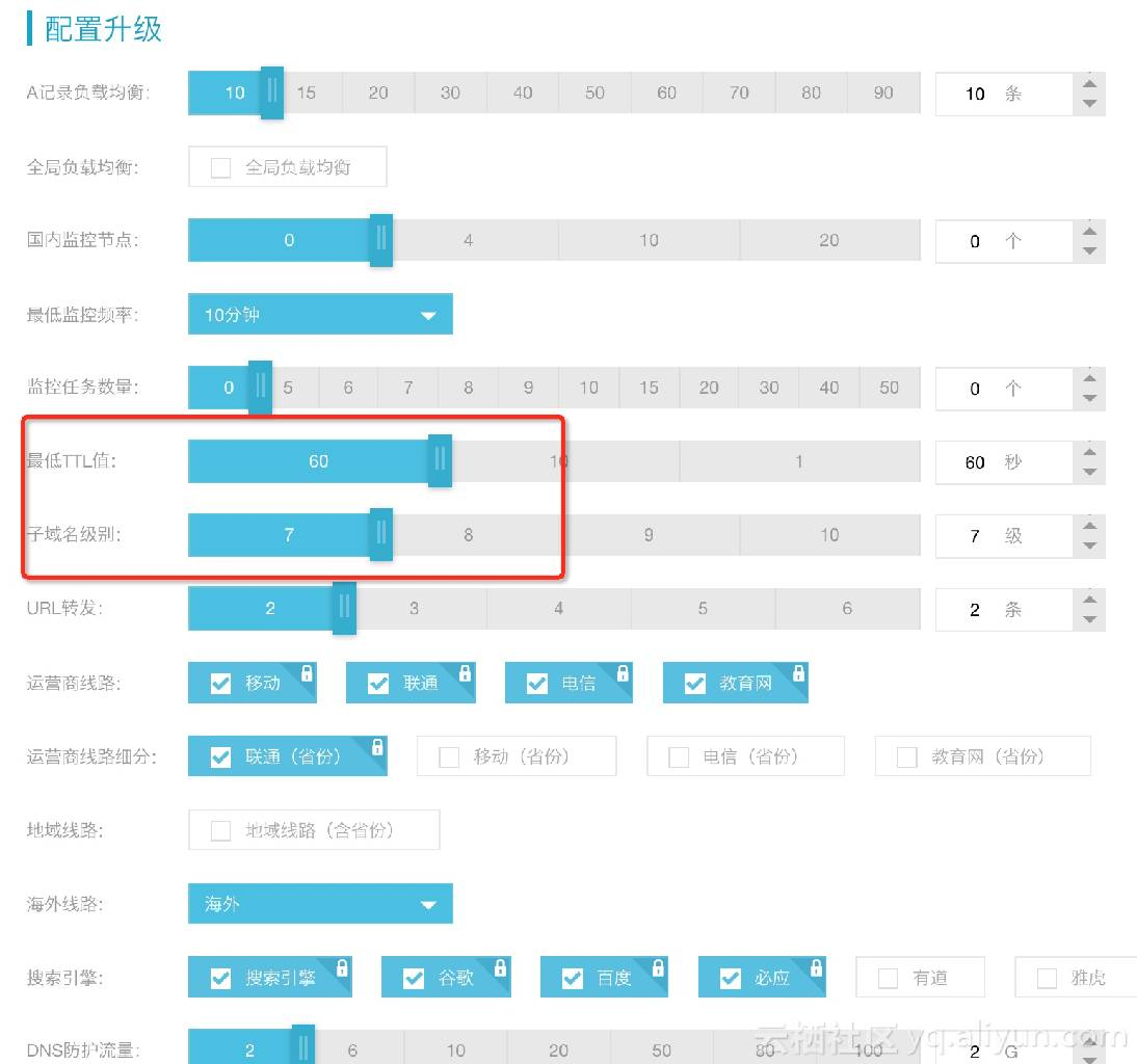 在弹出的页面中更改最低TTL值为60s,子域名级别为7级,然后保存。
