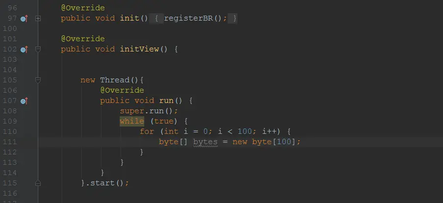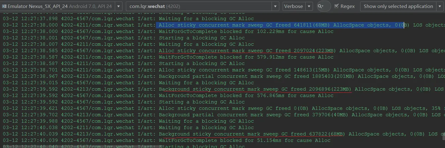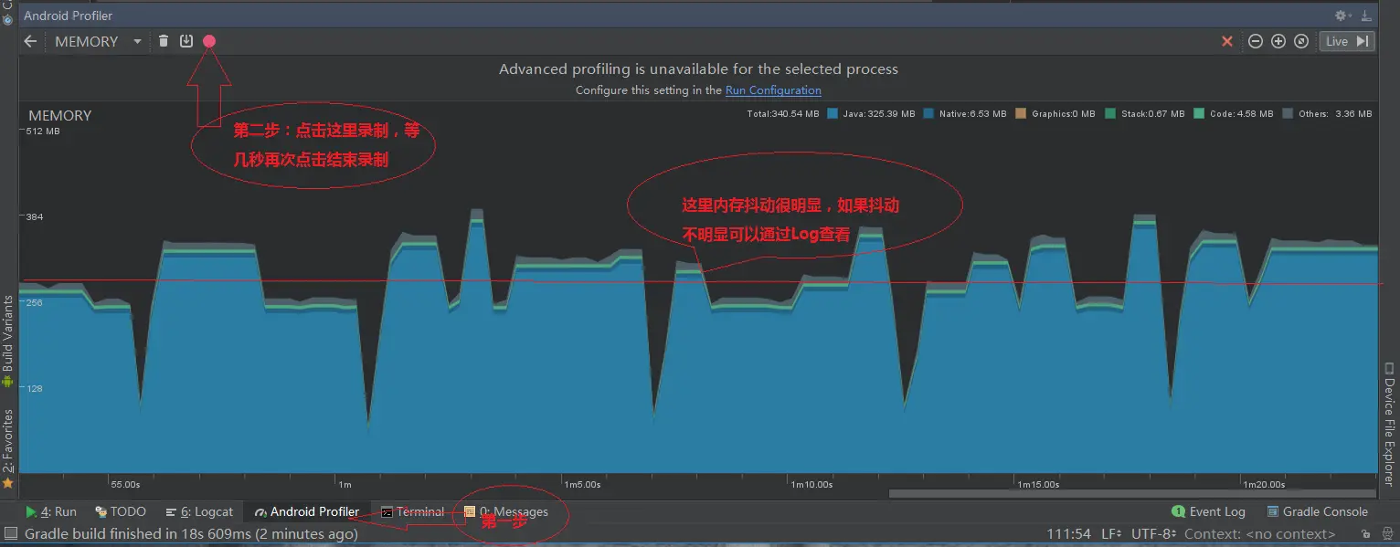 Android 内存抖动 ___f 2018-03-12 349 阅读1分钟 内存抖动是指内存频繁的分配和回收内存,而频繁的gc会导致卡顿,严重时一样会导致OOM。Android 使用分代收集算法(主要使用CMS垃圾收集器),使用的标记清除算法,所以会产生内存碎片。检测优化内存抖动:运行app,打开Android Profiler ,也可以在Log中查看可以看到GC一直在回收录制完成后的界面,根据第1 2 3不找到对应的MainActivity中的一个内部类,双击会直接跳到对应行这下面是我自己写的一个内存抖动列子。