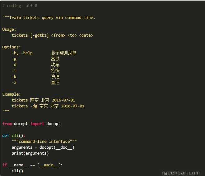 docopt可以按我们在文档字符串中定义的格式来解析参数,在tickets.py中:
