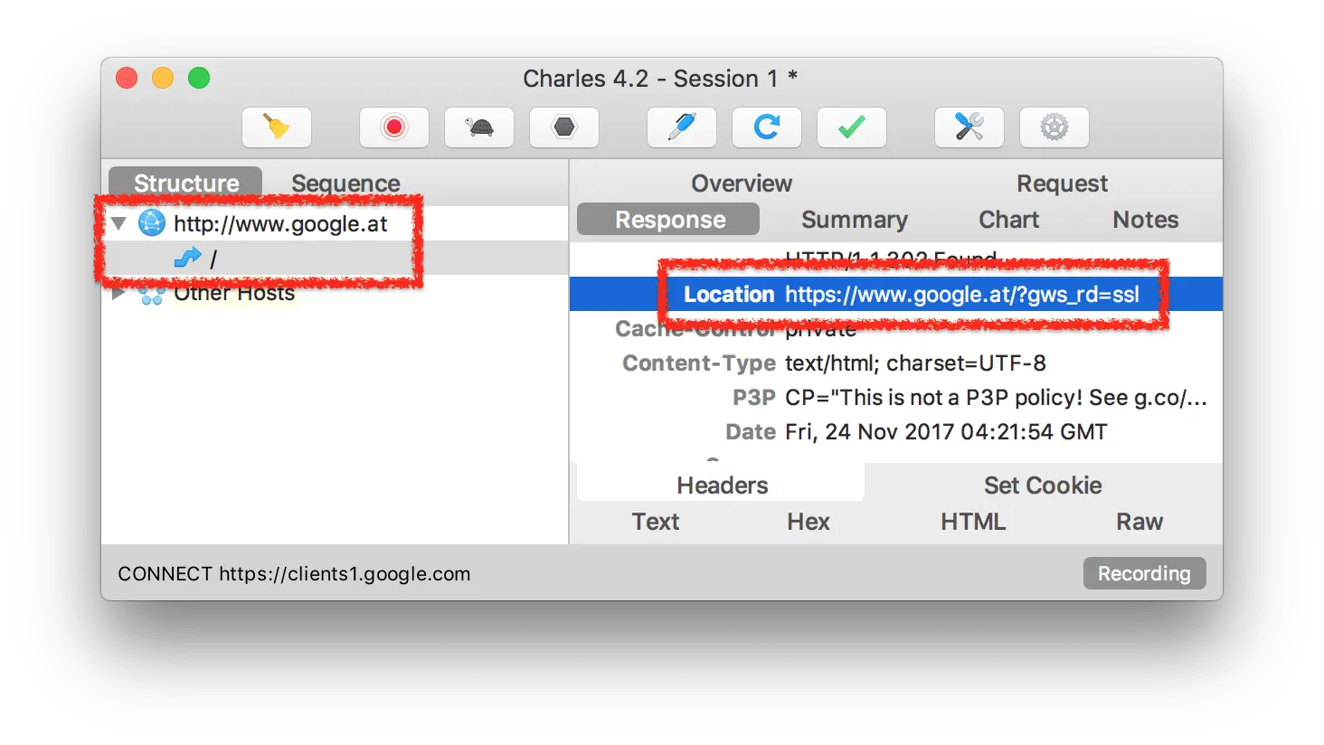 这个切换并不是在你的浏览器中发生,而是来自于远端的服务器(google.com),因为你的客户端(现在即浏览器)并不知道主机支持哪一种端口。(除了使用 HSTS 的主机)