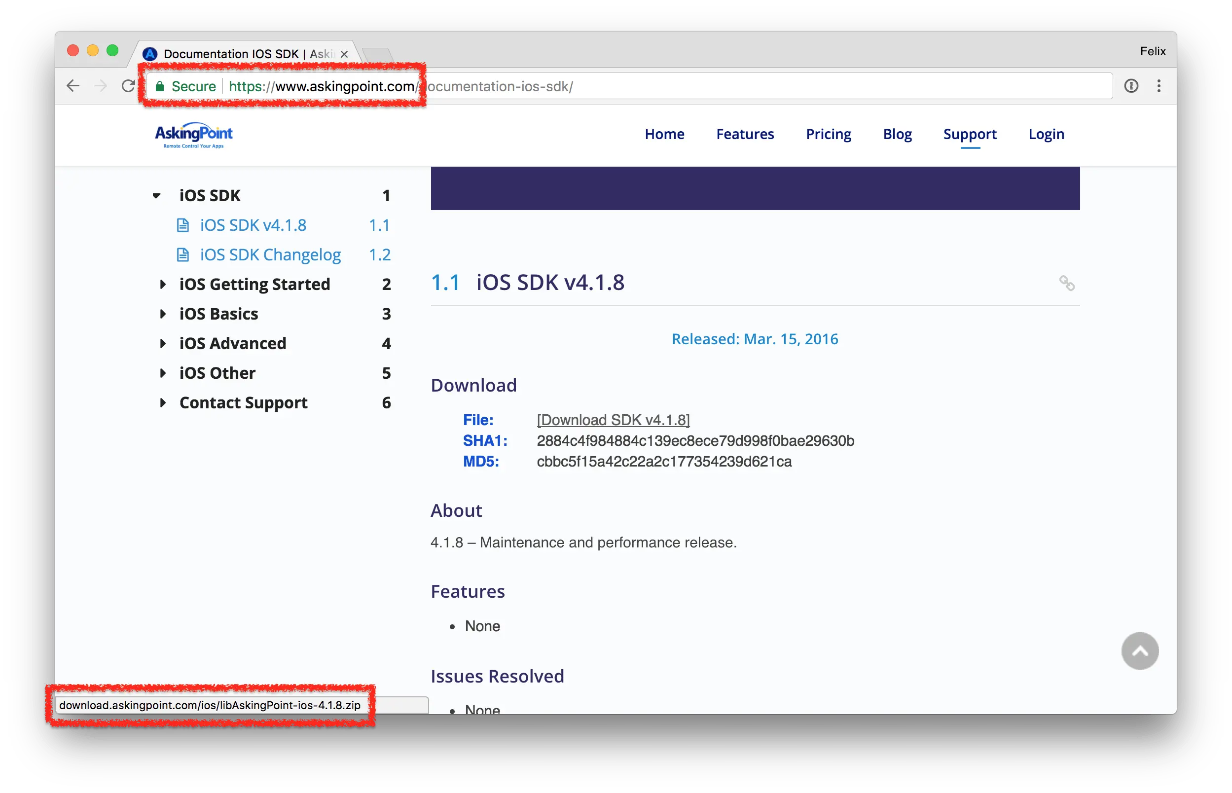 在我进行这项研究的时候,AWS iOS SDK 的下载页面使用了 HTTPs 加密,但链接至了一个未经加密的 zip 下载文件,与之前所提到的 SDK 相似。这个问题在被披露后,亚马逊解决了它。