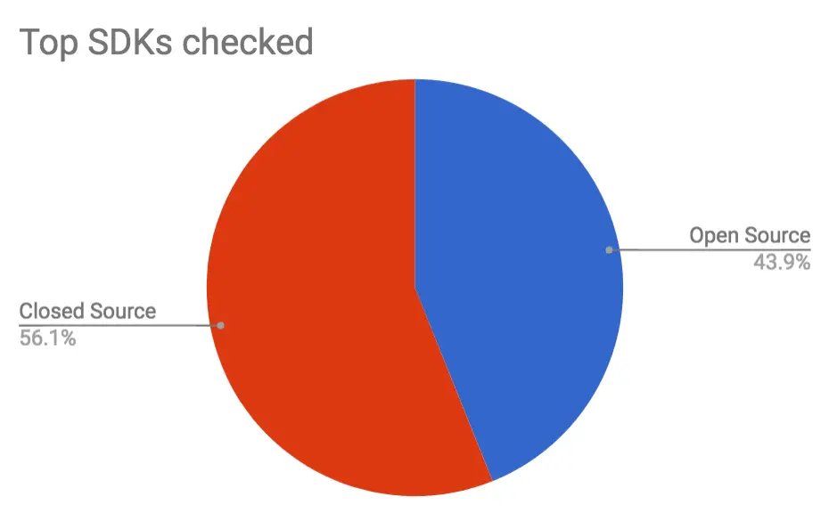 我从 2017 年 11 月 23 日开始研究,根据 AppSight(将所有 Facebook 和 Google 的 SDK 算作一个,因为他们都采用了同一种安装方法——略过所有在 GitHub 上开源的 SDK),调查了 41 个最受欢迎的移动端 SDK。
