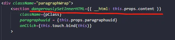 仔细看,这个属性用的是{{ }}2个括号而不是1个括号。原因是:第一{}代表jsx语法开始,第二个是代表dangerouslySetInnerHTML接收的是一个对象键值对。它接收的内容是html的,很容易收到XSS攻击,所以这个属性有了dangerous这个单词...