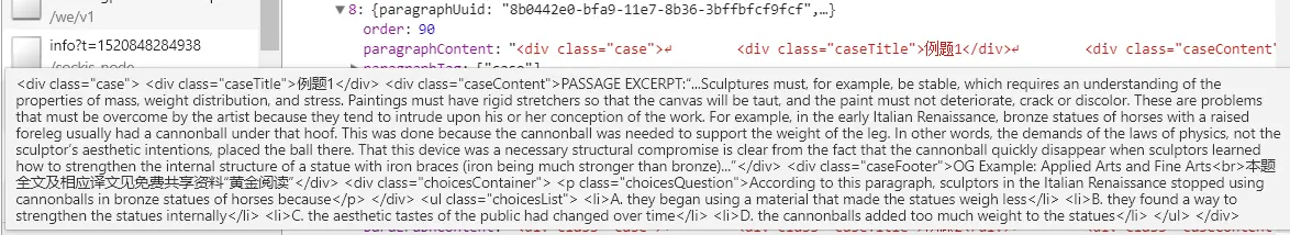 由于传给我的是一大段内容,里面的元素的类型不只一种、类名也不止一种,有div .caseTitle .caseContent strong等等,但是我只处理面积最大的一块英文,也就是只处理caseContent中的英文单词这就好办了。我没有用string的方法,去查找这个串在什么位置,怎么截取怎么拼接。没有。我利用了DOM的原理,借助DOM原生的api帮助我得到我要的英文单词。我创建了一个div(没有DOM我就自己创建DOM咯),然后DOM查找.caseContent,用空格把其中的所有单词提取出来,再给每一个单词用span包起来,然后把.caseContent中的内容替换掉,同时div的innerHTML也就变了,最后改变paragraphContent。就这样把后端传过来的东西做了修改,再使用。