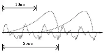 图中,每帧的长度为25毫秒,每两帧之间有25-10=15毫秒的交叠。我们称为以帧长25ms、帧移10ms分帧。图中,每帧的长度为25毫秒,每两帧之间有25-10=15毫秒的交叠。我们称为以帧长25ms、帧移10ms分帧。