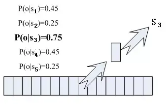 那每帧音素对应哪个状态呢?有个容易想到的办法,看某帧对应哪个状态的概率最大,那这帧就属于哪个状态。比如下面的示意图,这帧对应S3状态的概率最大,因此就让这帧属于S3状态。