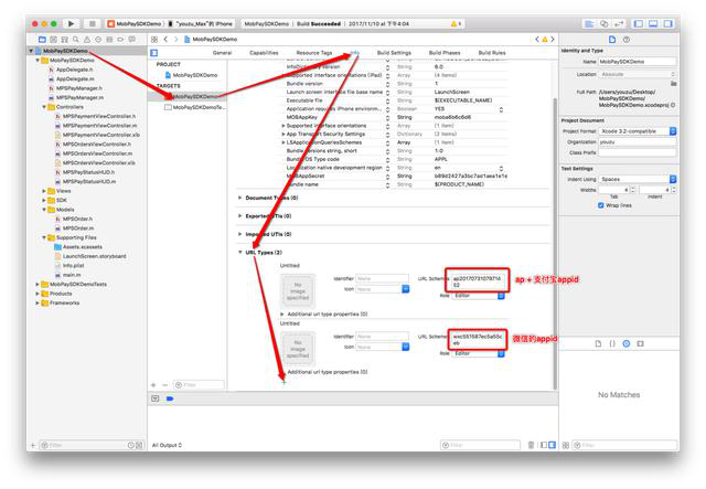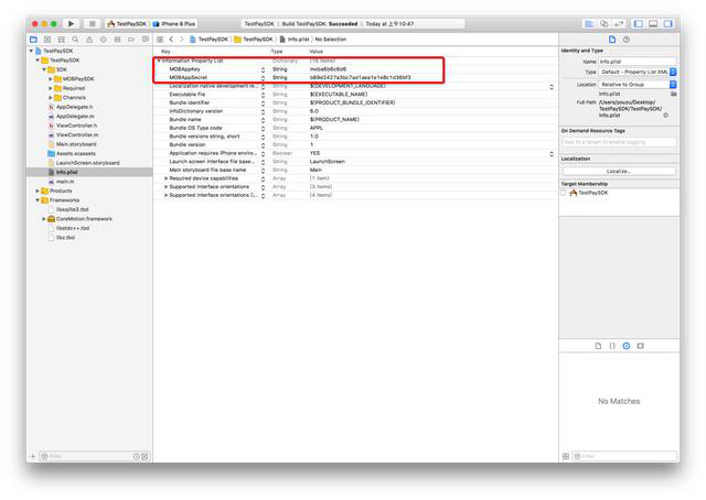 在项目中的info.plist文件中添加键值对,键分别为 MOBAppKey 和 MOBAppSecret ,值为步骤一申请的appkey和appSecret