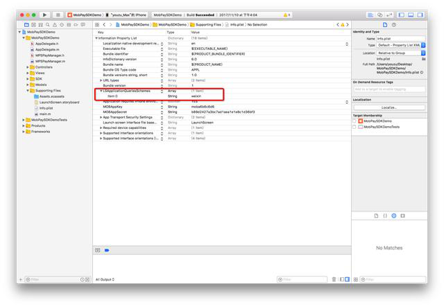 在Info.plist里添加 键为 LSApplicationQueriesSchemes 值为数组的键值对,并在数组中加入各平台所需的白名单