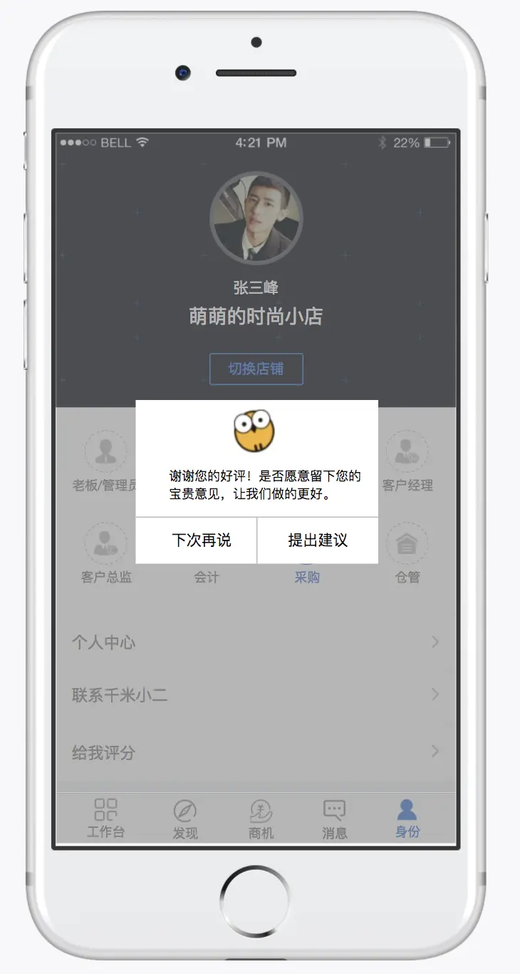 - 首先弹出一个弹框提示用户评分,那个五星是假的没法选择(可以给用户一个心理预期)