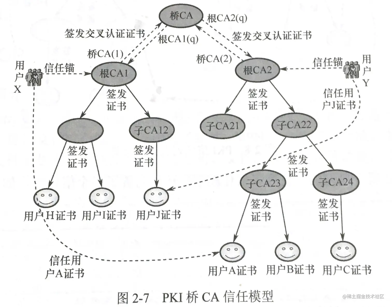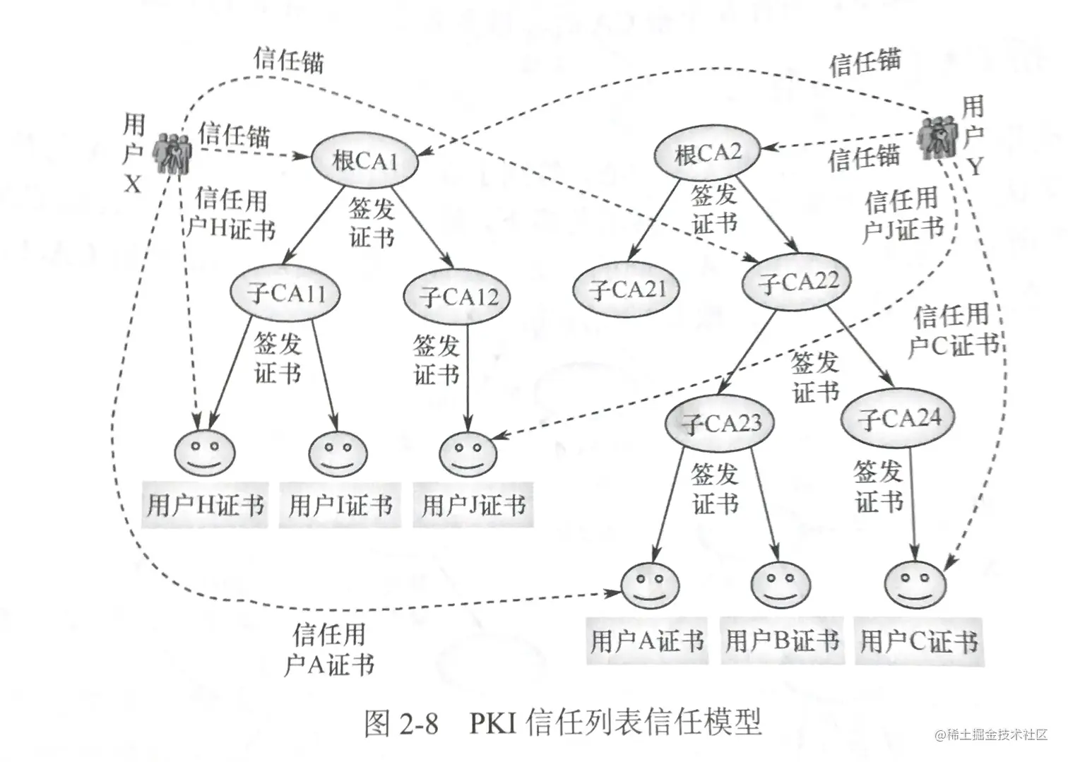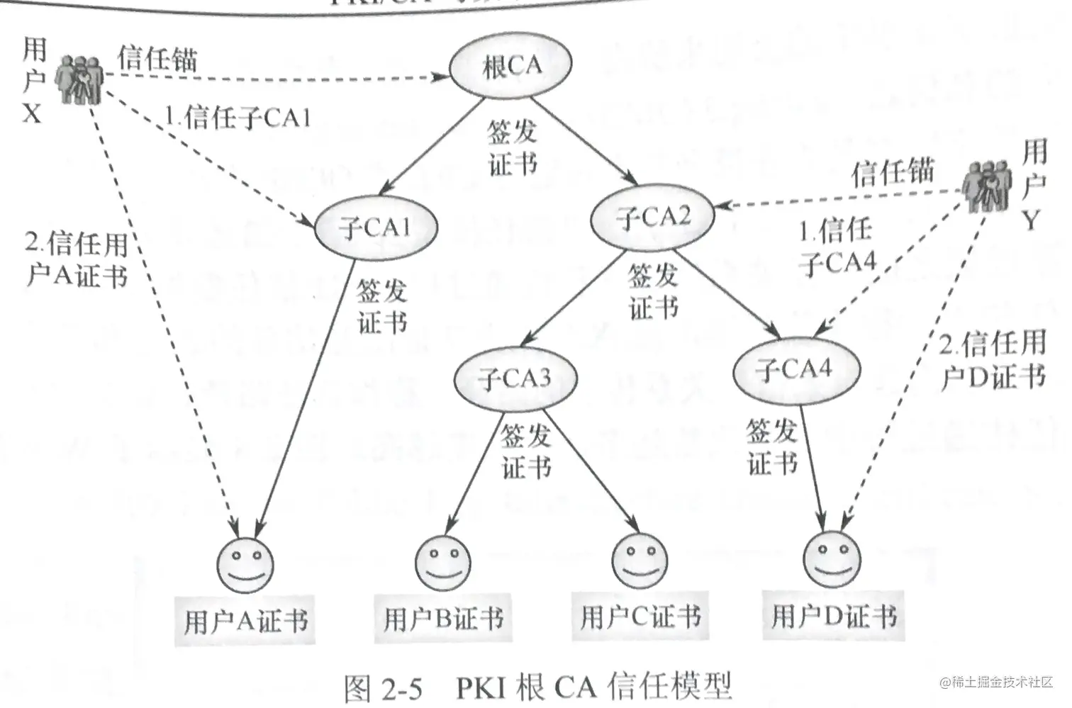 最上级CA中心只有一个,成为根CA,其它CA称为子CA。根CA的数字证书由自己签发,属于自签名证书,子CA的数字证书由上级CA证书签发。信任锚可以是根CA,也可以是子CA。