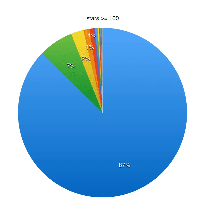 - 搜索接口返回的数据显示,Github上共有 39,919,570 个开源项目,当然这里面大部分是个人存储的代码仓库,如果把 star 数大于 100 的的项目认为是真正的开源项目,那么有 110,512 个,较去年增长了 37%。