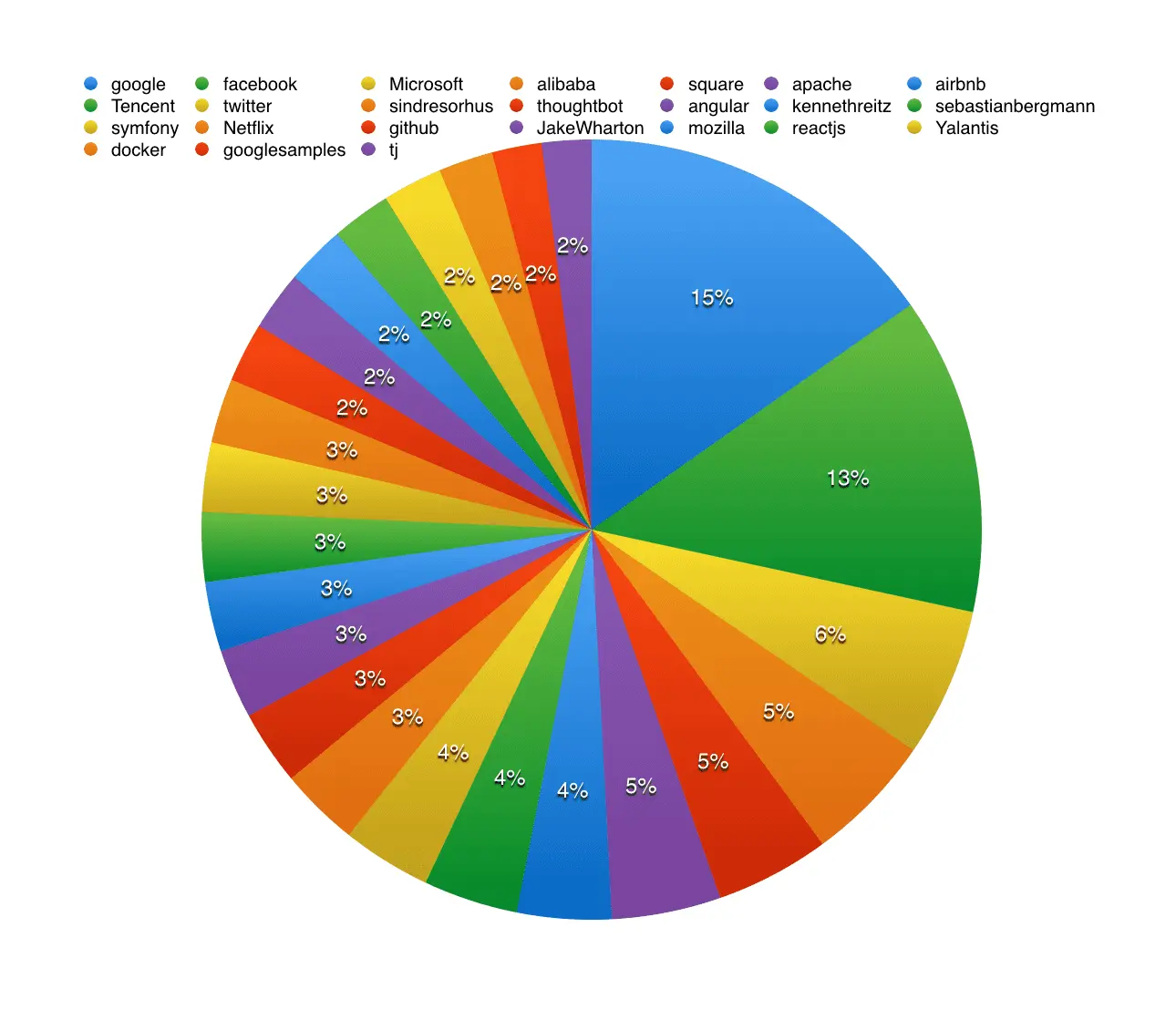 较去年比较,可以看到,变化最大的是腾讯,腾讯在过去一年里大力推进了开源工作,新开放了大量优秀的项目。