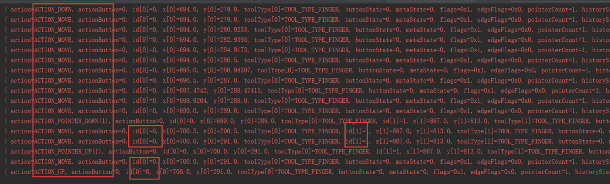 2.分析的内容,这边不做详细的截图,自己去打印查看,我们分析两个点,开始一个点是action=ACTION_DOWN,然后move,id就是0,点下第二个点,action=ACTION_POINTER_DOWN(1),id为1,第一个点的id还是0,并且可以看到两个点的坐标都是存在的,也就是这个MotionEvent是带着两个点的,接着释放一个点,这个时候你会看到如果释放的是第二个点,action=ACTION_POINTER_UP(1),如果释放的是第一个点,那么action=ACTION_POINTER_UP(0),当释放最后一个点的时候action=ACTION__UP