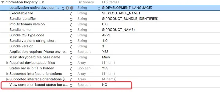 接下来,启动后要显示状态栏并且设置状态栏字体为白色,在Info.plist 里面添加 View controller-based status bar appearance 设置value为NO,