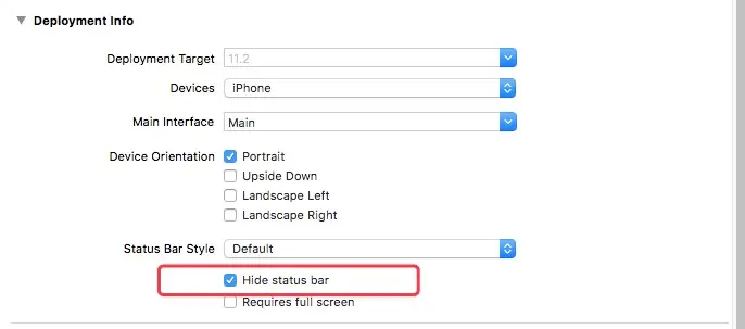 首先启动时隐藏状态栏,选中TARGETS下面的工程,选中General,勾选Hide status bar,即可在启动时隐藏状态栏。