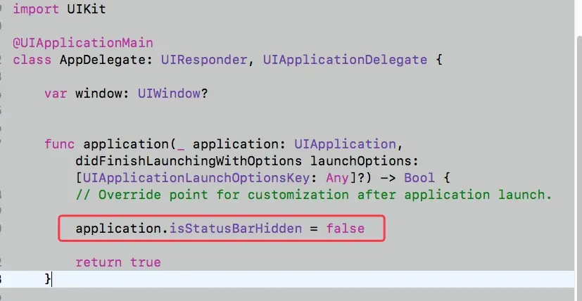然后在AppDelegate中的didFinishLaunchingWithOptions方法中设置状态栏的隐藏状态为否,
