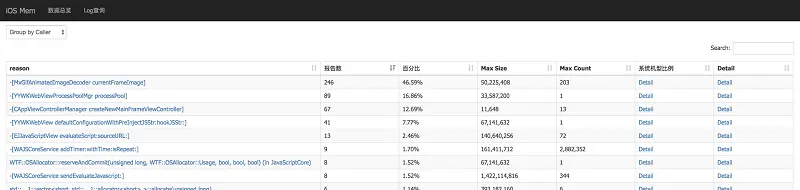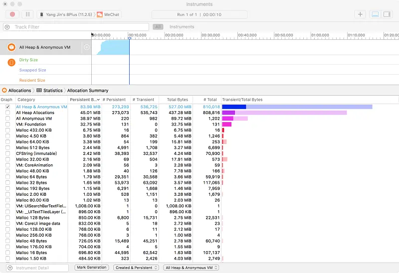 页面展现参考了Allocations,可看出有哪些Category,每个Category分配大小和对象数,某些Category还能看分配堆栈。