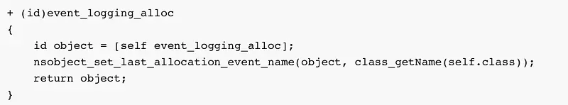 但后来发现,NSData创建对象的类静态方法没有调用+[NSObject alloc],里面实现是调用C方法NSAllocateObject来创建对象,也就是说这类方式创建的OC对象无法通过hook来获取OC类名。最后在苹果开源代码CF-1153.18找到了答案,当CFOASafe=true并且CFObjectAllocSetLastAllocEventNameFunction!=NULL时,CoreFoundation创建对象后通过这个函数指针告诉上层当前对象是什么类型: