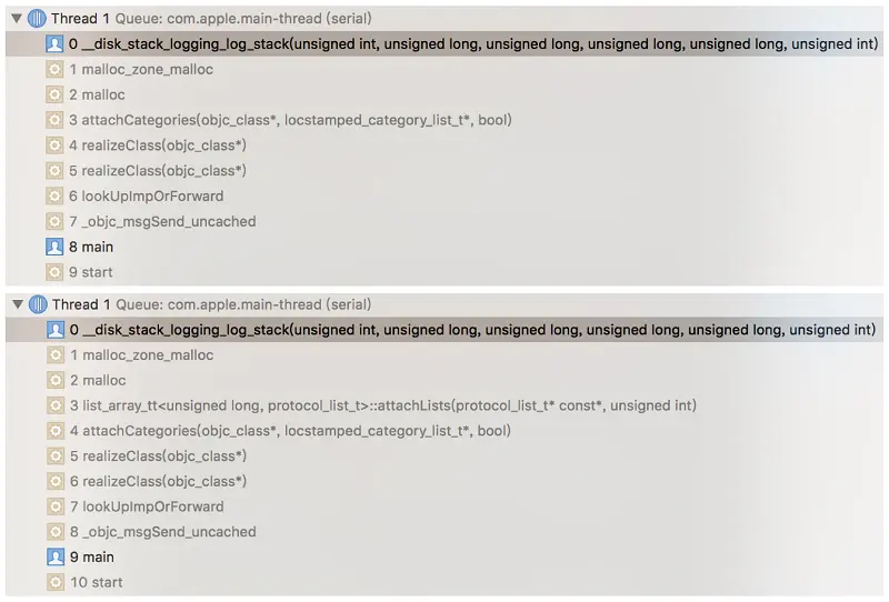 当malloc_logger和__syscall_logger函数指针不为空时,malloc/free、vm_allocate/vm_deallocate等内存分配/释放通过这两个指针通知上层,这也是内存调试工具malloc stack的实现原理。有了这两个函数指针,我们很容易记录当前存活对象的内存分配信息(包括分配大小和分配堆栈)。分配堆栈可以用backtrace函数捕获,但捕获到的地址是虚拟内存地址,不能从符号表dsym解析符号。所以还要记录每个image加载时的偏移slide,这样符号表地址=堆栈地址-slide。