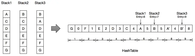 为此,可以用Hash Table来存储这些堆栈。思路是整个堆栈以链表的方式插入到table里,链表结点存放当前地址和上一个地址所在table的索引。每插入一个地址,先计算它的hash值,作为在table的索引,如果索引对应的slot没有存储数据,就记录这个链表结点;如果有存储数据,并且数据跟链表结点一致,hash命中,继续处理下一个地址;数据不一致,意味着hash冲突,需要重新计算hash值,直到满足存储条件。举个例子(简化了hash计算):