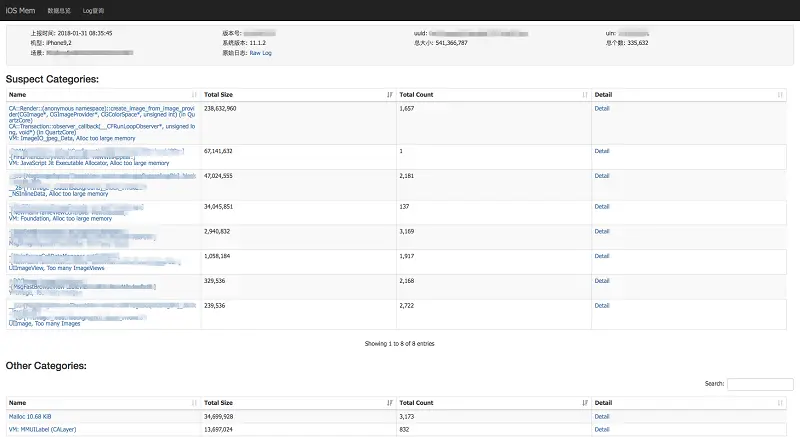 为了突出问题,提高解决问题效率,后台先根据规则找出可能引起FOOM的Category(如上面的Suspect Categories),规则有: