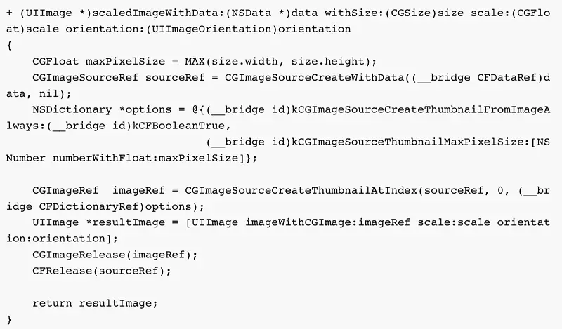 但处理大分辨率图片时,往往容易出现OOM,原因是-[UIImage drawInRect:]在绘制时,先解码图片,再生成原始分辨率大小的bitmap,这是很耗内存的。解决方法是使用更低层的ImageIO接口,避免中间bitmap产生: