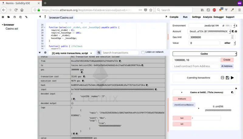 好了!一切运行正常。就像前面提到的,当使用 javascript VM 时,第一个块总是 1,所以第一个中奖号码总是 2。我们可以通过在 value 字段中输入 1 ether 来测试,并将 2 作为参数传递给 bet。