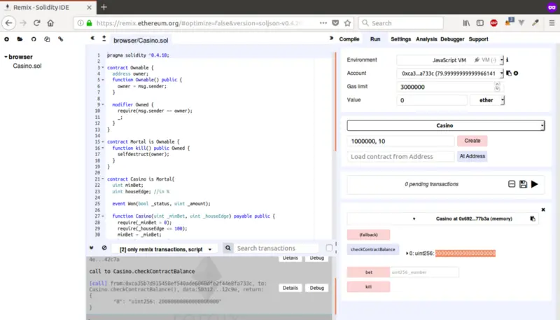 在 remix 的右上角单击 run 选项卡。确保将环境设置为 Javascript VM。在 value 字段中输入 20 并从下拉列表中选择 Ether 而不是 Wei 。这将在部署时使用 20 Eth 预加载合约。下面,在 create 按钮旁边输入我们的构造器参数 minBet 和 houseEdge (比如,10000 wei 和 10% 的庄家上风)。