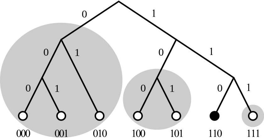 - 如果该位是 0,进入左子树,是 1 则进入右子树(反过来也可以);