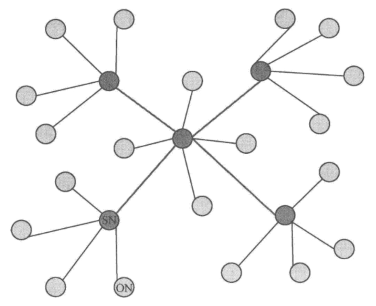 再来看看第三种路由结构:混合式。混合式其实就是混合了集中式和分布式结构,如下图所示,网络中存在多个超级节点组成分布式网络,而每个超级节点则有多个普通节点与它组成局部的集中式网络。一个新的普通节点加入,则先选择一个超级节点进行通信,该超级节点再推送其他超级节点列表给新加入节点,加入节点再根据列表中的超级节点状态决定选择哪个具体的超级节点作为父节点。这种结构的泛洪广播就只是发生在超级节点之间,就可以避免大规模泛洪存在的问题。在实际应用中,混合式结构是相对灵活并且比较有效的组网架构,实现难度也相对较小,因此目前较多系统基于混合式结构进行开发实现。其实,比特币网络如今也是这种结构,后面再细说。