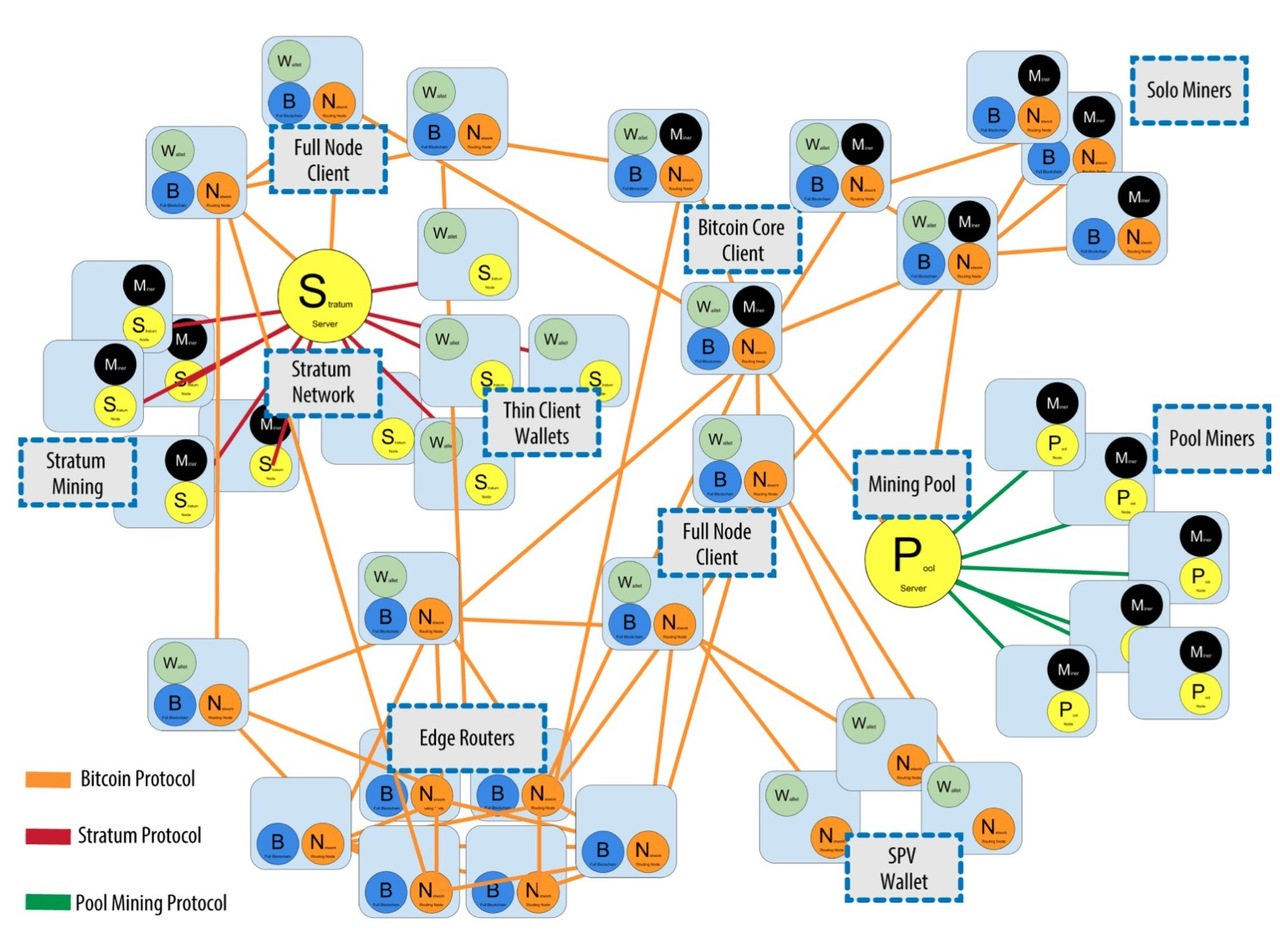 在整个比特币网络中,除了不同节点间使用比特币协议作为通信协议的主网络,也存在很多扩展网络,包括上面提到的矿池网络。不同的矿池网络可能还会使用不同的矿池挖矿协议,目前主流的具体矿池协议应该是 Stratum协议,该协议除了支持挖矿节点,也支持瘦客户端钱包。一个包含了比特币协议主网络各种节点和 Stratum 网络,以及其他矿池网络的扩展比特币网络大概如下图所示: