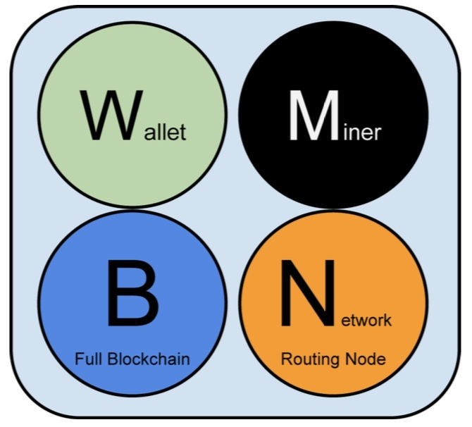 首先,比特币网络中的节点主要有四大功能:钱包、挖矿、区块链数据库、网络路由。每个节点都会具备路由功能,但其他功能不一定都具备,不同类型的节点可能只包含部分功能,一般只有**比特币核心(bitcoin core)**节点才会包含所有四大功能。