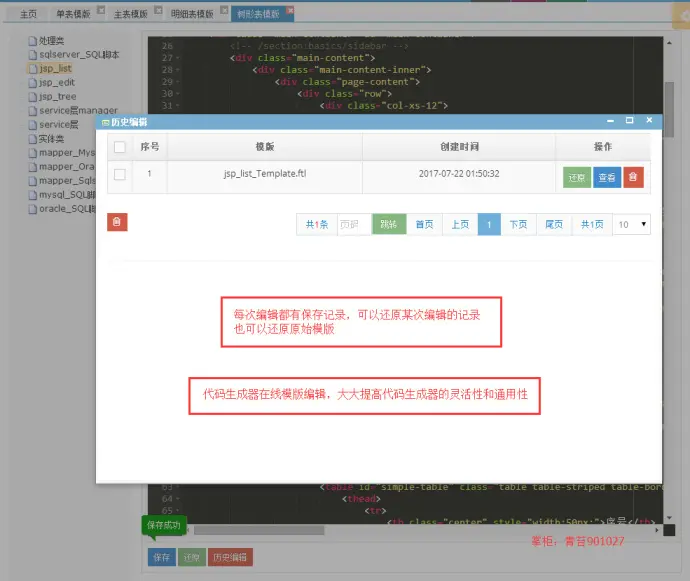 模版管理:代码在线编辑器,管理模版,保存编辑记录,一键还原,代码生成器如虎添翼