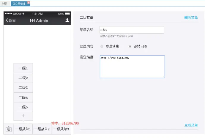 公众号管理:维护多公众号信息,配置appid和appsecret 支持微信自定义菜单