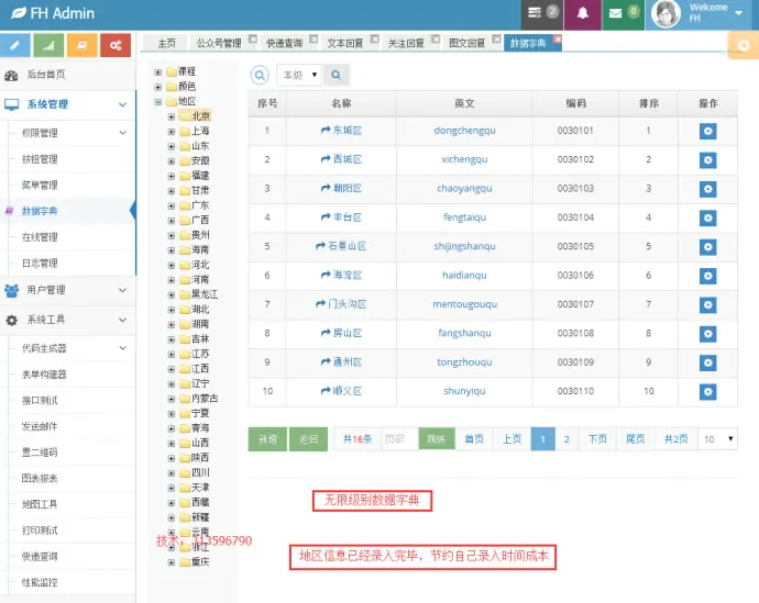 . 数据字典:无限级别,支持多级别无限分类。内设编号,排序等