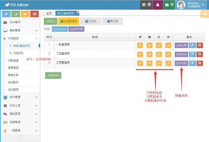 角色(基础权限): 分角色组和角色,独立分配菜单权限和增删改查权限。