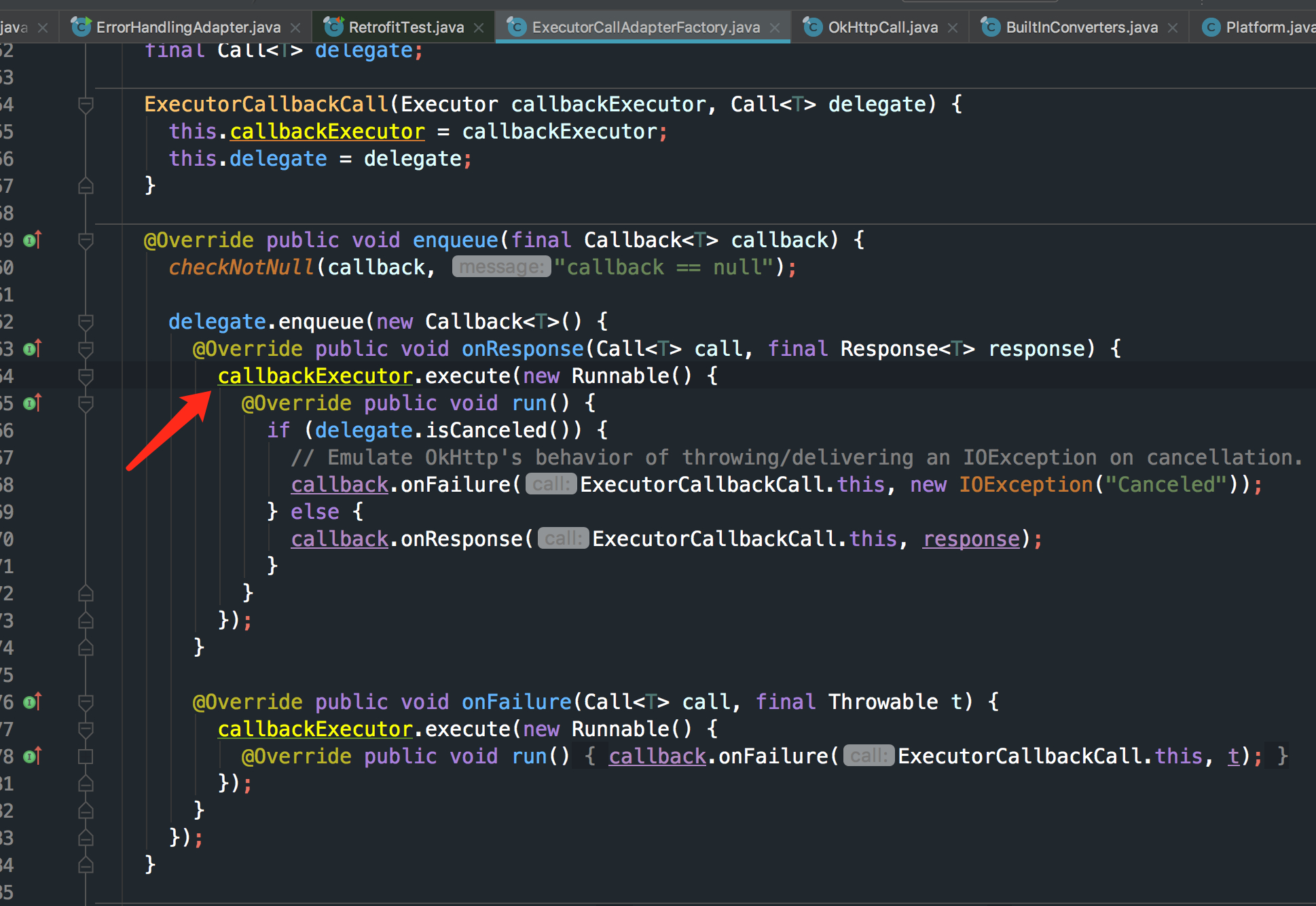 从上面的代码可以看到很显然这是装饰者模式, 对OkHttpCall的方法进行了包装.在retrofit.create()得到一个Call对象之后, 调用这个Call对象的enqueue()方法实际上是调用一个ExecutorCallbackCall对象的enqueue()方法, 不信可以将这个Call对象的名字打印一下