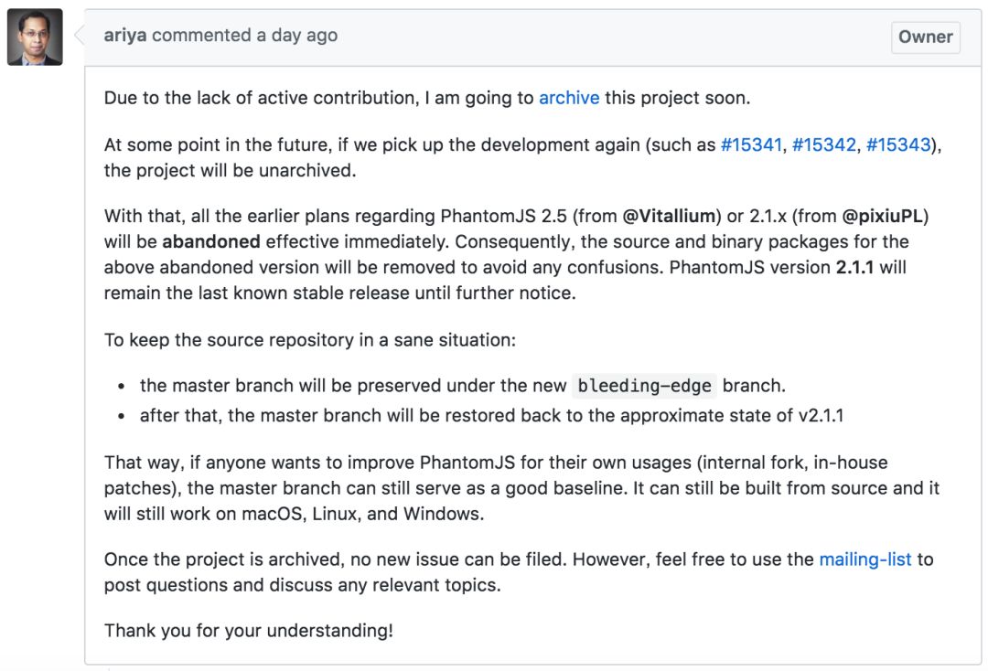 之后,ariya 发布了“暂停开发”的通知,表示由于缺乏积极贡献,项目将封存归档,不再接受新的 Issue 提交。不过,邮件列表依然可以用来发布问题并讨论项目相关的话题。PhantomJS 2.1.1 是归档前的最后一个稳定版本。未来如果他们再次拿起项目进行开发(例如 #15341,#15342,#15343 ),项目将被取消存档。