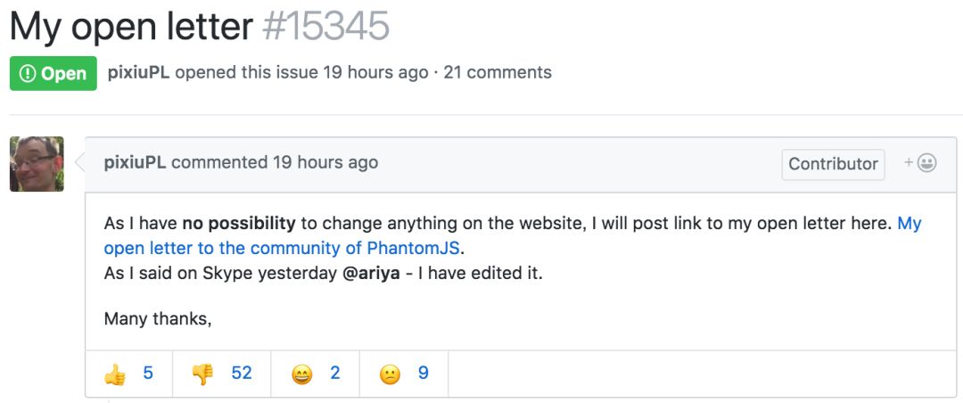 2018 年 3 月 2 日,PhantomJS 的另一位核心开发者 pixiuPL 发布公开信 表示,自己已被迫辞任 Collaborator 。