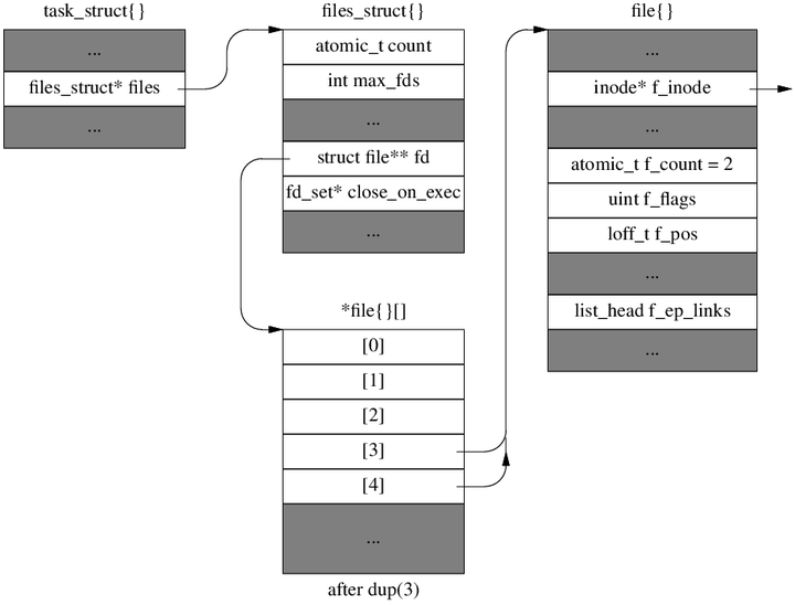 将同一个listening socket加入多个epoll能否降低响应时间?有人提到可以对 listening socket 使用 dup(2) 来达到相同的效果,这是行不通的。原因在于 dup(2) 不会复制 struct file 本身,而只是复制 struct file 指针,并把 file 里的引用计数加一(f_count 成员)。对两个 fd 的读写操作还是通过同一个 file 对象进行,性能不会提高(见下图示意)。你把 3 和 4 两个 fd 分别加到两个 epoll 中,实际上是把同一个 file 加到了两个 epoll 中(file 的 f_ep_links 成员会把这两个 epoll 串起来),这跟 SO_REUSEPORT 有本质的区别。进一步可参考 《Linux 4.5/4.6 中对 SO_REUSEPORT 的改进》。