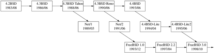 最后,我们看看 BSD 与 FreeBSD 内核里是怎么做的。以下是 BSD 的版本简史。