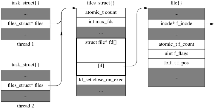 Linux 从诞生以来,一直用 struct task_struct 来表示进程/线程,用 struct file 表示打开的文件,用 struct inode 表示文件本身。struct file 和 struct inode 的区别在于,如果两次 open 同一个文件(比方说 web server 写 access log,你用 less 看这个 assess log 文件),会有两个 struct file 对象,指向同一个 struct inode 对象。容易想到,打开文件的偏移量(offset)应该放在 struct file 里(web server 打开的 access log 的偏移量在文件末尾,你用 less 打开的 access log 的偏移量在文件开头),而文件本身的长度应该放在 struct inode 里(web server 往 access log 里继续写入内容,你不需要重新打开文件就能看到)。换句话说,你用 ls -l 命令看到的信息(除了文件名本身)都存在 struct inode 里;(f)stat(2) 返回的内容也都存在 struct inode 里。在过去的很长时间里,更新 struct file 中偏移量的代码有多线程安全方面的 bug,直到 2014 年 3 月底发布的 Linux 3.14 才修复,也就是说 Ubuntu 14.04 里的 write(2) 系统调用不是线程安全的。Bugs - Shuo Chen's Notes