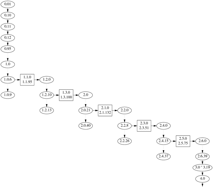 从 1991 年9 月发布的 Linux 0.01 起,Linux 已经走过了 1/4 世纪。下图是陈硕根据《Linux kernel "historical" git repository with full history》整理的内核版本简史。Linux 2.6 之前,内核采用的版本命名规则是“奇数开发、偶数稳定”。据此