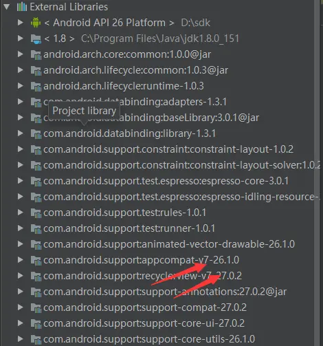 在抛出的异常中我们可以发先应该是support v7包冲突了。通过万能的度娘,有大神说v7包与recyclerview包的版本不一致会导致上面的异常。于是我检查了两个包的版本,发现都是26版本的,并不存在不同的问题。