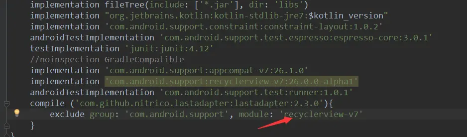 于是在引入包的同时,排除了第三方包本身引入的recyclerview的包。