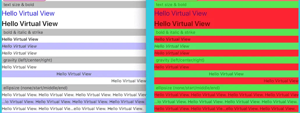 在模拟器中,打开上图菜单中高亮的开关,需要进行 alpha 混合的元素就会被用红色标记出来。我们拿 VirtualView 的文本元素 demo 截图为例来展示下效果: