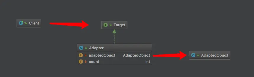 Adapter: Target的实现类,主要负责该功能的实现,其内部持有AdaptedObject的对象,利用其对象完成本次需要提供的新功能.